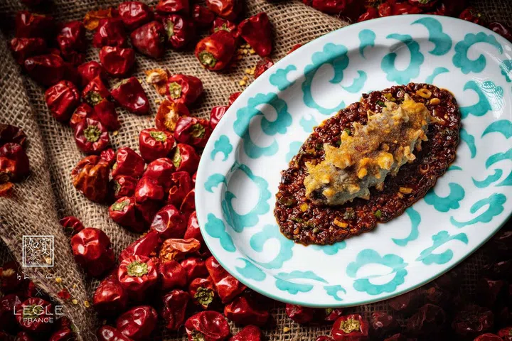 椒汁味是近几年来广受欢迎的新味型,源于许凡大师于2002年的创作:以大量的绿色二荆条辣椒、新鲜青花椒、藤椒油,混合出不同层次的辛香;碧绿翠青,交织成清新的麻与辣,是极现代而优雅的味型。选用生长于水库五十米深处的大型野生翘壳鱼,珍稀难寻,寒冽清澈的潭水令肉质细腻,脂如白玉。以奇香沁人的椒汁味烹之,回味甘鲜。