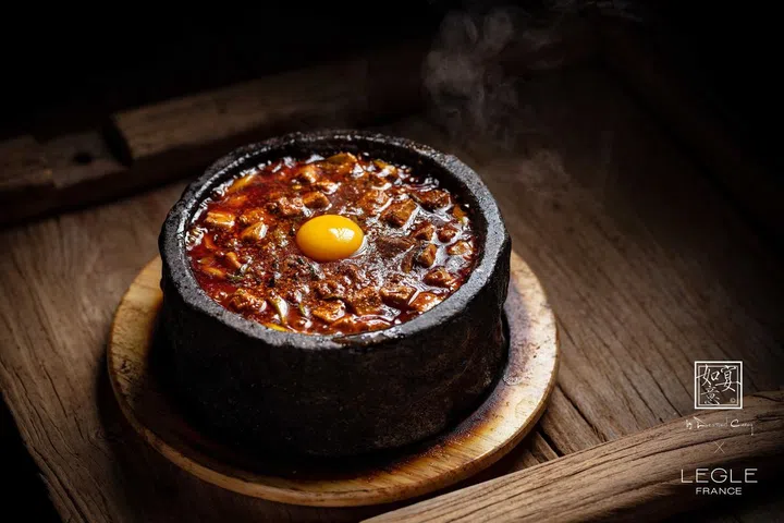 麻婆豆腐是道无人不知的川菜,也代表着标准的麻辣味型。麻是花椒,辣是辣椒与豆瓣,鲜是豆豉,捆是芡汁,酥是牛肉臊子,嫩是泹水豆腐,烫是滚油热烫,香是红油。许家艺创菜的麻婆豆腐使用陈年五年的郫县鹃城豆瓣酱,并以不同品种的花椒、辣椒,捣碎成“面”为底,再加上自家炼制的花椒油、红油,呈现多层次的麻与辣。以烧烫的石锅盛装上桌,更觉香气袭人。