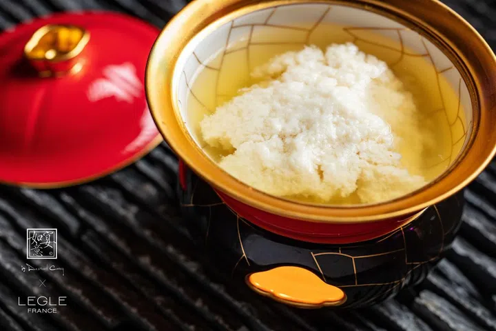 回归恬静,成都如意宴奉上滋润窝心的收尾——葛仙贡米炖雪莲。天山雪莲口感润泽,滋养身体。产于湖北恩施鹤峰的葛仙贡米稀少而珍贵,带有蓝藻的幽微咸鲜;不加入其他调味干扰清香,仅以山中野蜜简单提味,展现大自然的丰美、和谐。以中国传统的盖碗呈现,上有盖、下有托、中有碗;盖为天、托为地、碗为人,暗含天地人和之意。如意盖碗的底碟烧成金色窗格纹,和茶碗的金与白相映成辉;手绘纹饰典雅方正,赏心悦目。