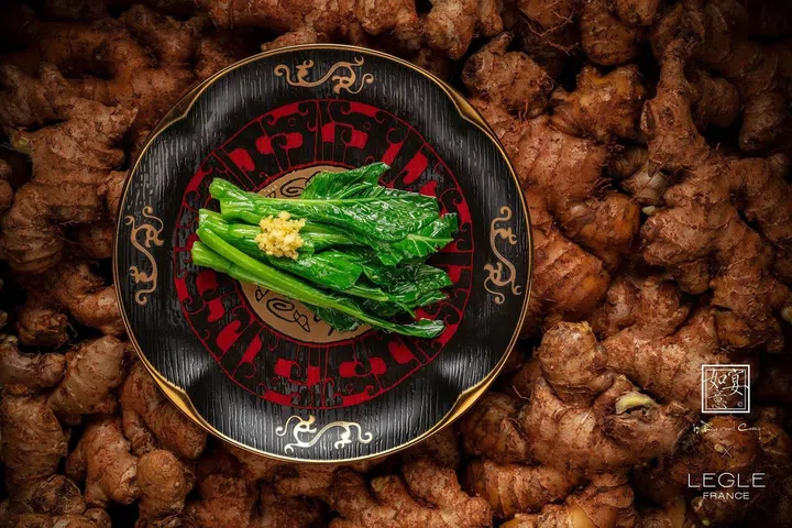 姜汁味型有热有冷,工序香气大不相同。成都冬季有着极美味的蔬菜。姜汁时蔬,蔬菜的鲜与清爽姜汁的暖,彼此唱和。最简单的食材以最华美的色彩彰显,又以深沉底色突出蔬菜翠绿,取得平衡。搭配姜汁时蔬的器皿受战国时代的成都漆器启发,仿其朴拙的图纹与陈旧感。“蜀”字甲骨文的金色与图纹的红色皆为皇家色彩,突显如意宴尽心营造的古皇朝风范。
