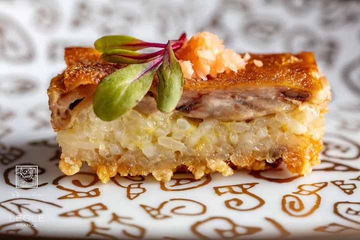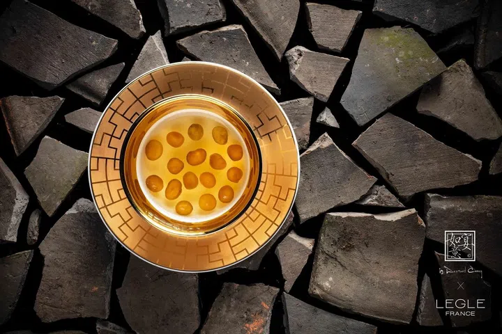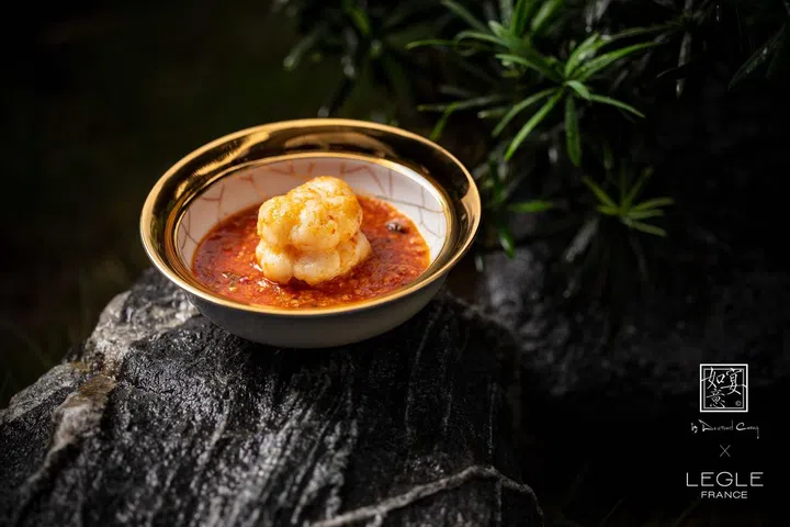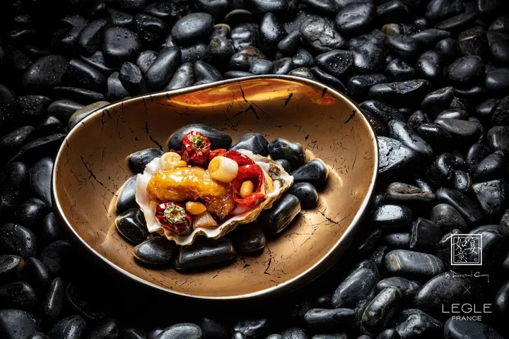川人的“尚滋味,好辛香”,在代表糊辣荔枝味的宫保生蚝表现得淋漓尽致。扑鼻而来是干辣椒、花椒高温升华后的迷人呛糊香,入口结合了生蚝的鲜,浓厚香醇,后韵引出清纯俏皮的甜酸荔枝味。完美说明了川菜给人的满足度,全方面且细致精巧。此次法国丽固将品牌中的无极系列融入成都如意宴中,边缘有如丝带翻转不拘的设计,取自天道无极之意,永续不止。加上华丽又带有古意的金箔设计,衬托滋味丰富的糊辣荔枝味型。