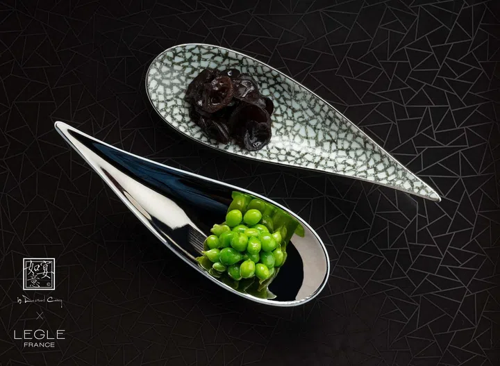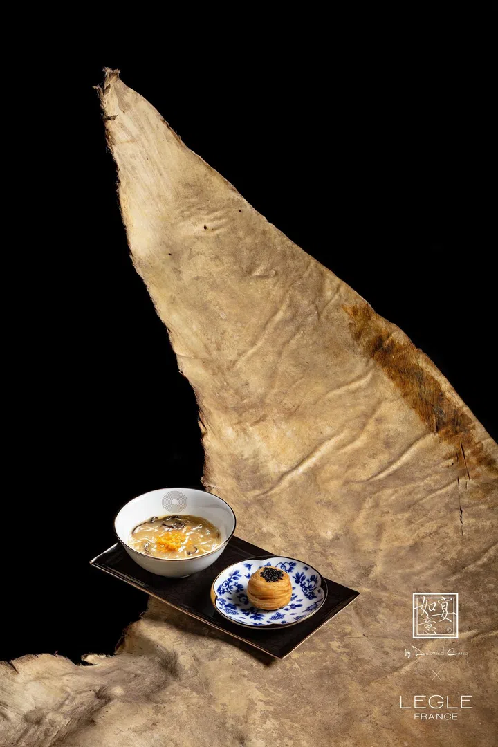 糟香味与葱香味味型以亚东木耳拼小蜜豆呈现。产于西藏喜马拉雅山麓的亚东木耳,小巧玲珑,肉厚富弹性,成都如意宴用醪糟发酵的醇香引出木耳的鲜爽。至于讨喜可人的清脆甜豆,则点以葱香。四川的葱香味型使用葱白与葱叶,还须以姜辅助;葱白取其浓香,葱叶取其清新,以热油激出飘香,炼成葱油,再以此为菜肴调味增香。以糟香、葱香两种单纯而悠长的味型来展演蔬菜的鲜甜,最适合不过。一菜一口,将宴席的节奏稍缓,来迎接下一波的味觉震撼。与之匹配的是冷色调的白金瓷匙与宋朝的漆器蛋壳裂纹瓷匙,循环对比有如太极阴阳之道,呈现两道清口素菜,简洁而庄重。