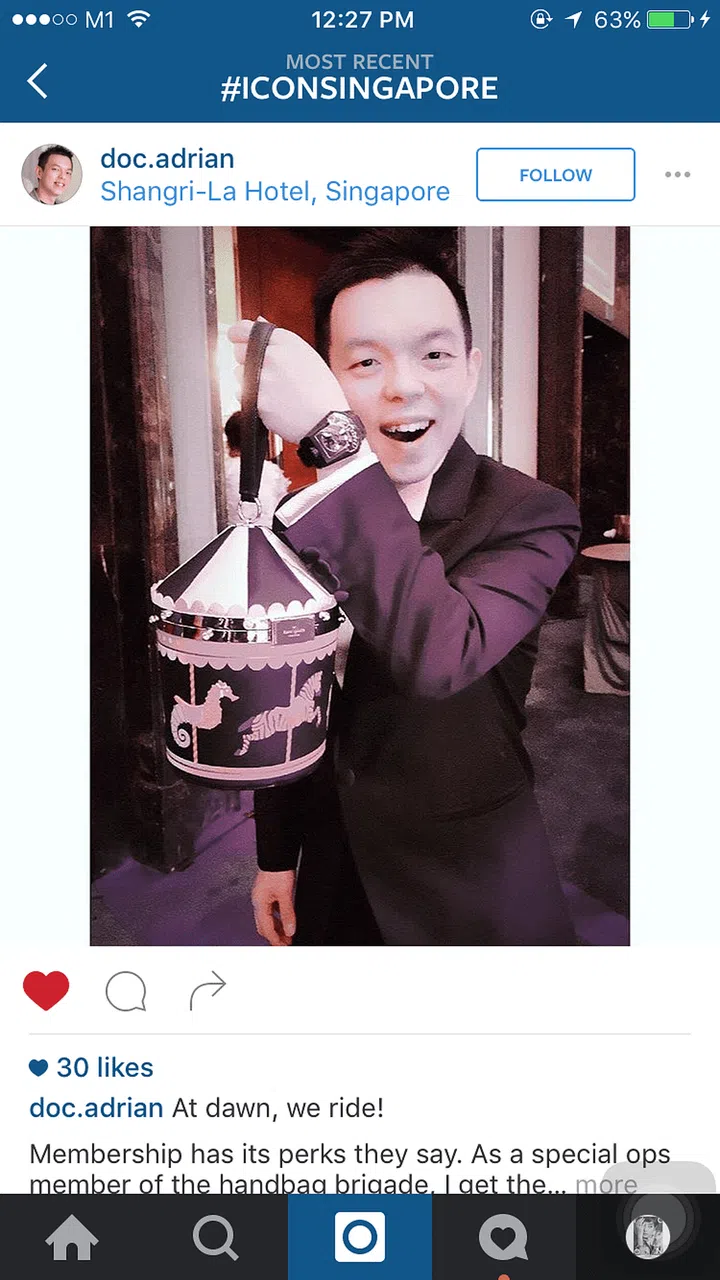 Doctor Adrian搞怪地拿起太太Loh May Han的手袋,俏皮地摆起姿势,看起来也太卡哇伊了吧!