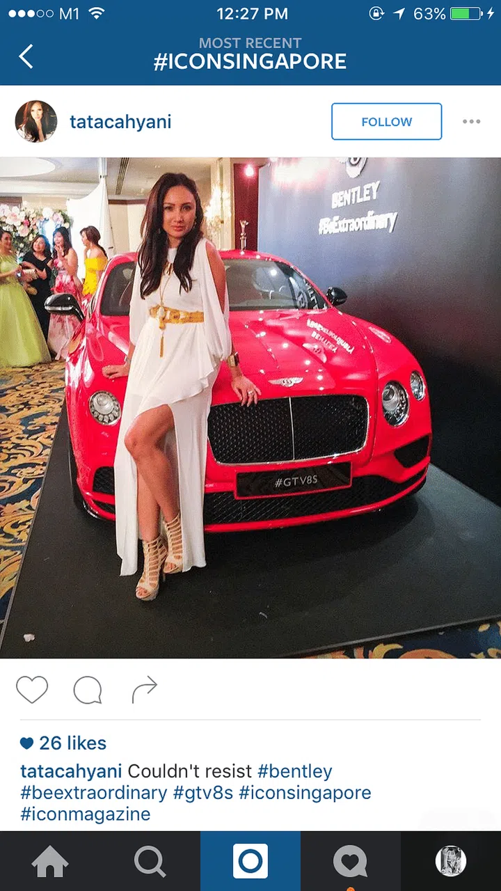 时尚名媛Tata Cahyani为我们示范什么叫香车配美人,纯白的礼服与鲜红色Bentley轿车格外匹配。