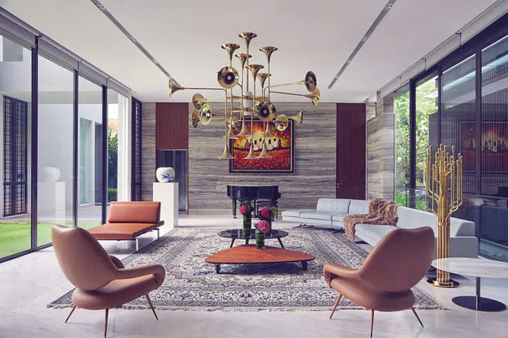 走入这个家,首先会被偌大的会客室吸引,葡萄牙著名灯饰Delightful的巨型Trumpet Light 是视觉焦点。