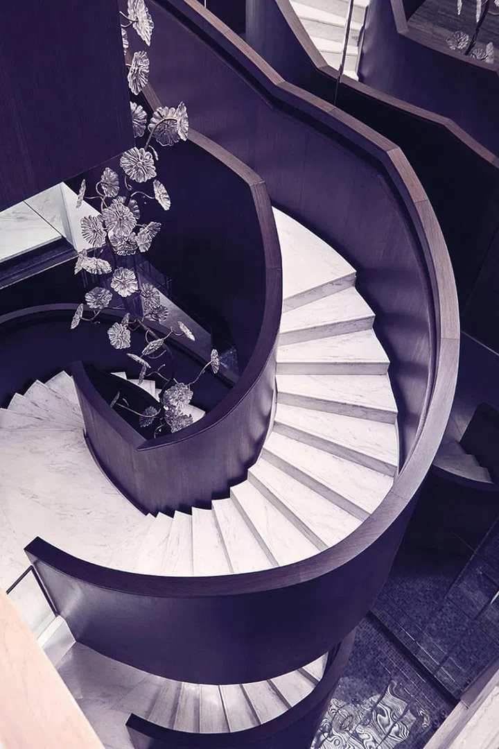 螺旋梯中央的花灯是视觉焦点,这是叶佩芳请人特别打造的艺术品。