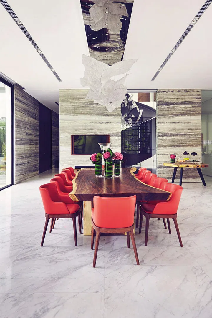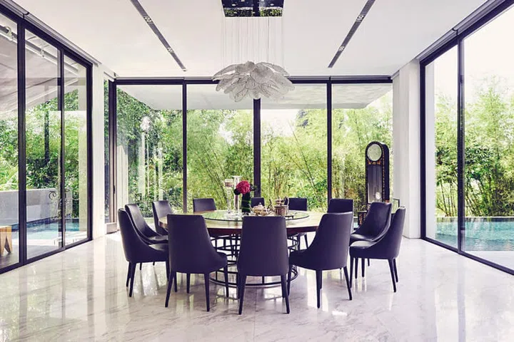 用餐区比会客室更宽阔,不难看出这是家人最常活动的空间。长型原木餐桌和圆形大桌可容纳30人。黄家大家长热衷于下厨,以食物拴紧一家人的感情。每逢周末亲友都会热热闹闹共聚一堂,吃的不是山珍海味,只是传统小吃;佐以笑声,就是这栋大宅最漂亮的画面。