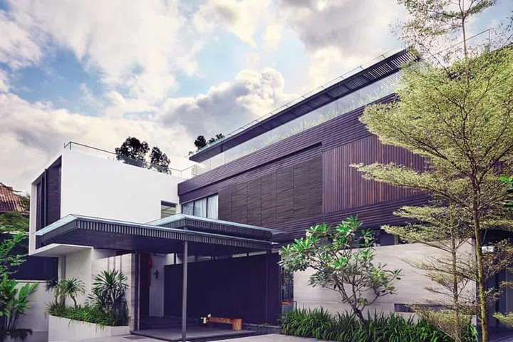 新家设计反映出男主人Mervin Wee简单、热爱大自然的个性。户外种满植物,以落地玻璃窗引进一室绿意。内部采用简约线条和黑白灰基本色作为基调,挑高楼顶增加视觉上的空间感。