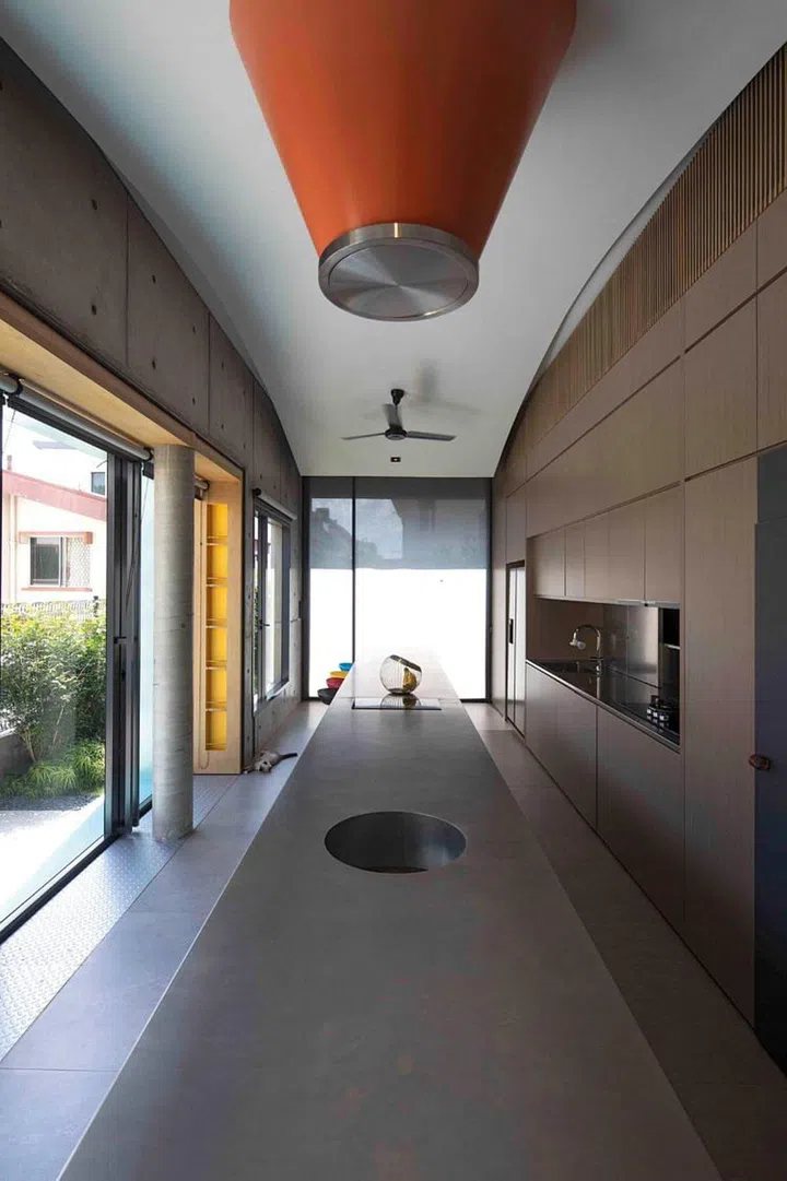 一楼主要是客厅、饭厅和干湿厨房区域,陈正勇强调厨房是家的心脏,因此把最大的空间保留给厨房。“我们设计过不计其数的房子,湿厨房通常会设置在外围,因为人们想隔绝油烟,但在这所房子,我们反其道而行,把湿厨房规划在屋内,并尽量美化它。”