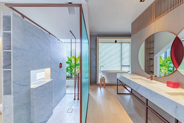 大理石洗手台,是他和太太飞到意大利卡拉拉,特地采购一整块大理石打造而成。