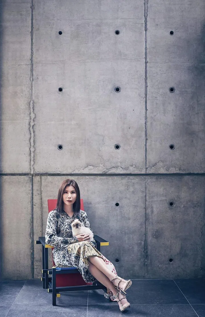 蔡玮玮Weekend Max Mara真丝裙/Max Mara、皮革高跟鞋/Jimmy Choo。
