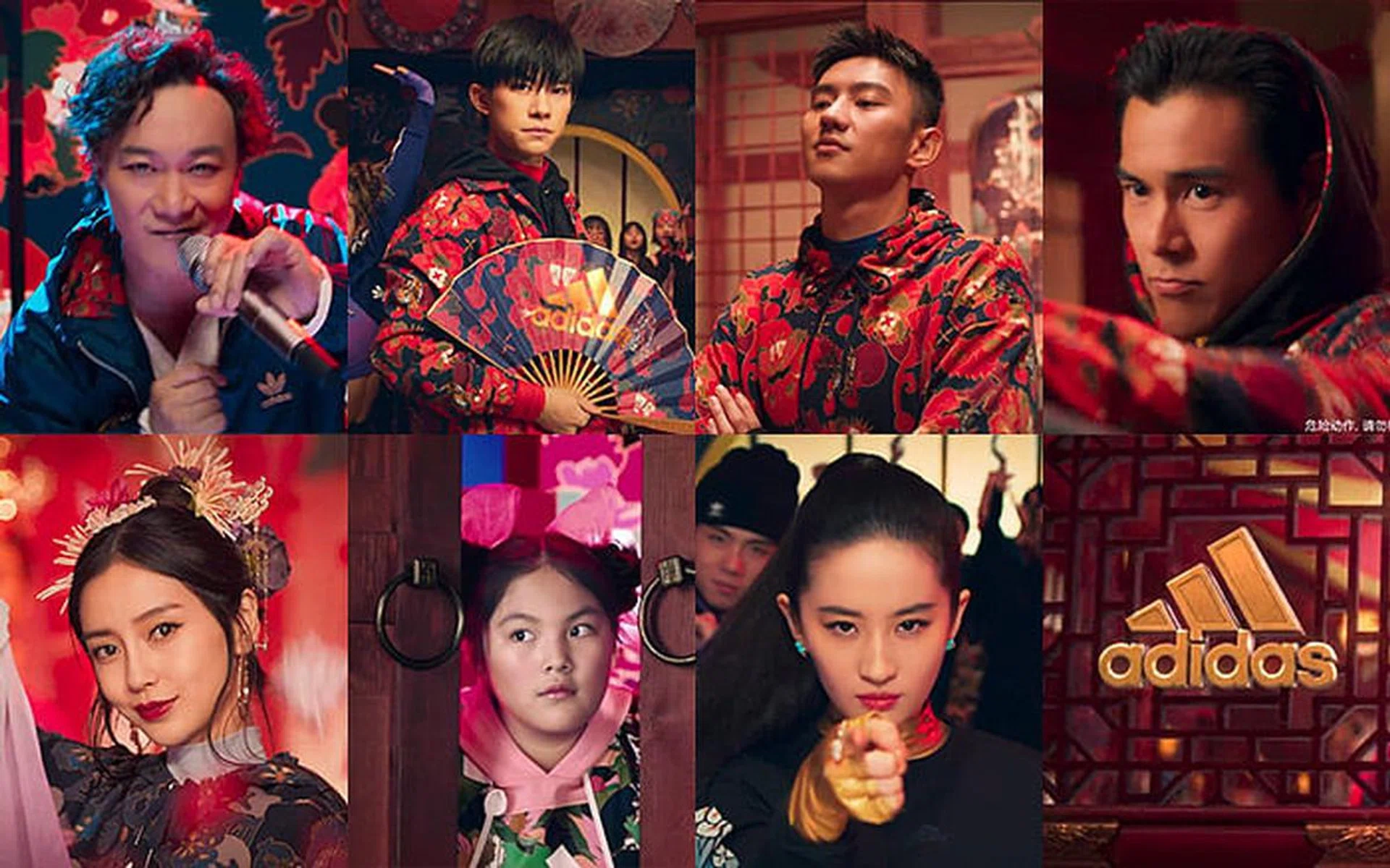 Adidas首次拍摄春节视频,大手笔请来众多明星撑场,包括:易烊千玺、陈奕迅、宁泽涛、彭于晏、Angelababy 与王诗龄等。众星齐聚,各县本领,片中结合舞蹈、演唱、射击等元素,把潮流与中华传统文化结合,展现新风气。