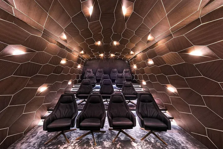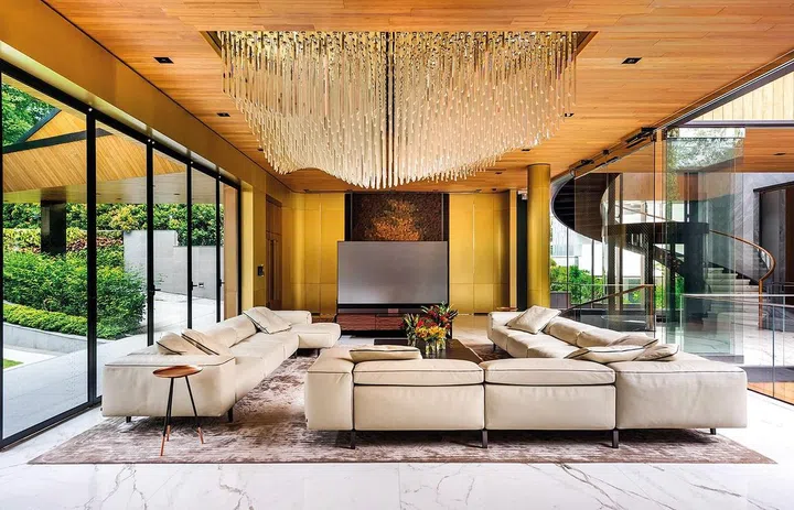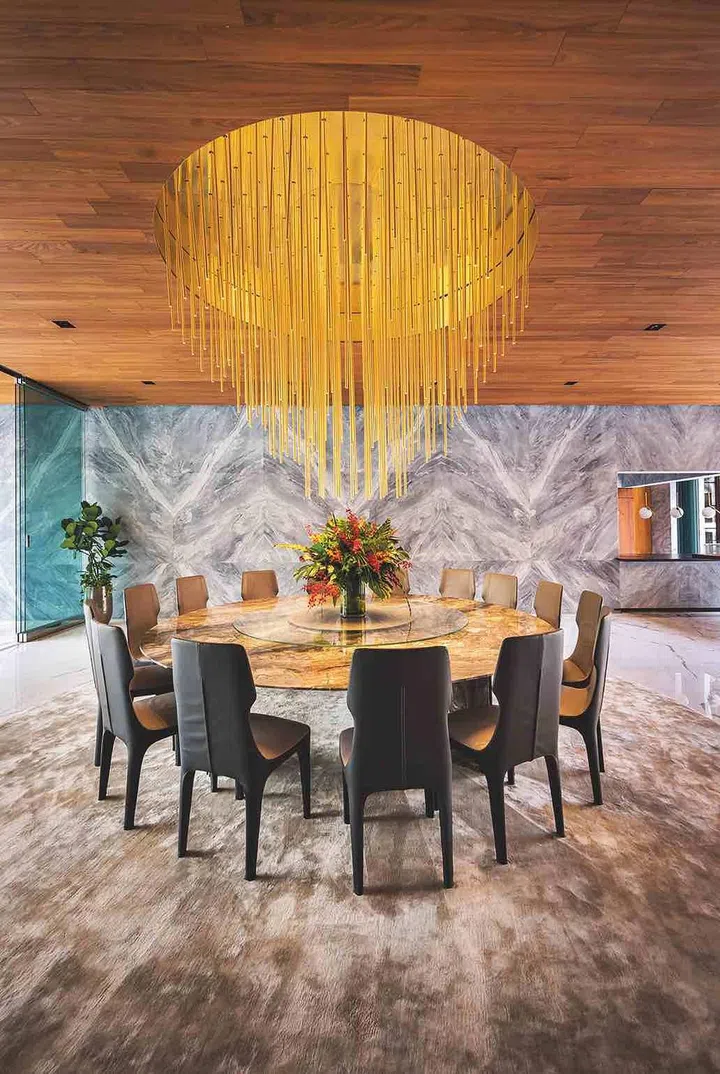 林佑龙说:“这是一栋智能屋,同时具备冷气、灯光、吊扇、音响与窗帘遥控功能。”他指出,餐厅天花板内有乾坤,镶嵌了高科技扩音板,与木质天花板融为一体,如果他不特别点出还真的看不出来。这个由潘怡诚所研发的扩音板也用在大宅电影院里,值得一提的是,会客厅犹如钟乳石的水晶灯,饭厅气派时尚兼容,具备208条灯管的巨型灯具设计皆出自潘怡诚之手。