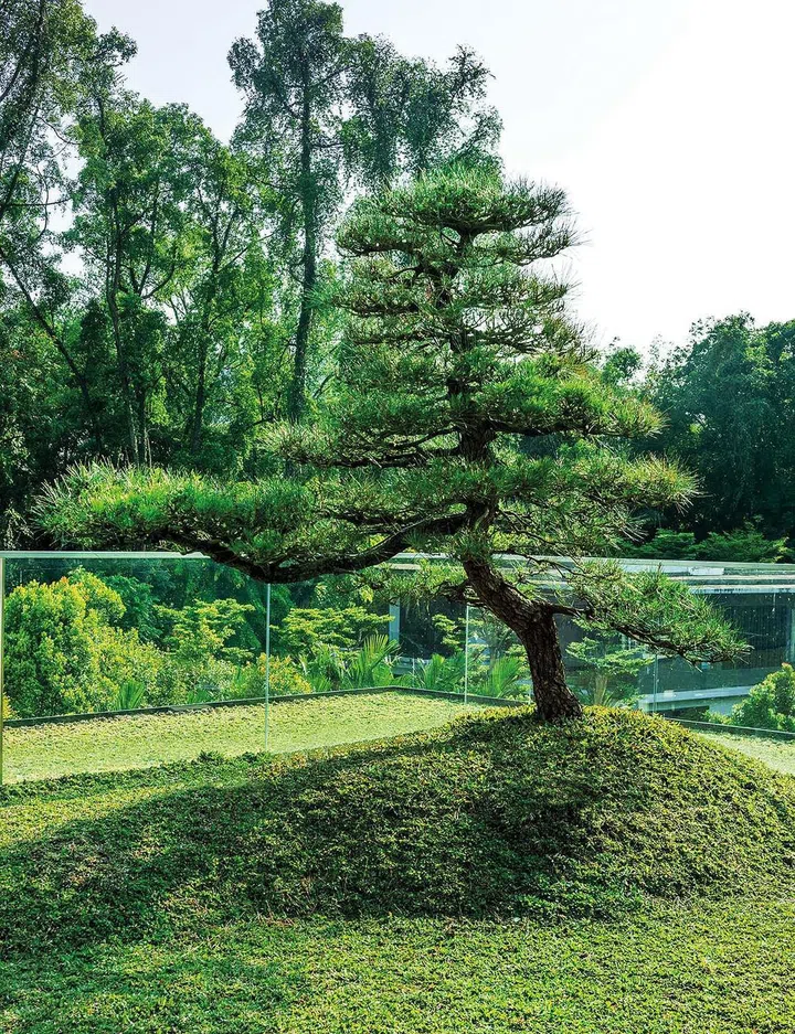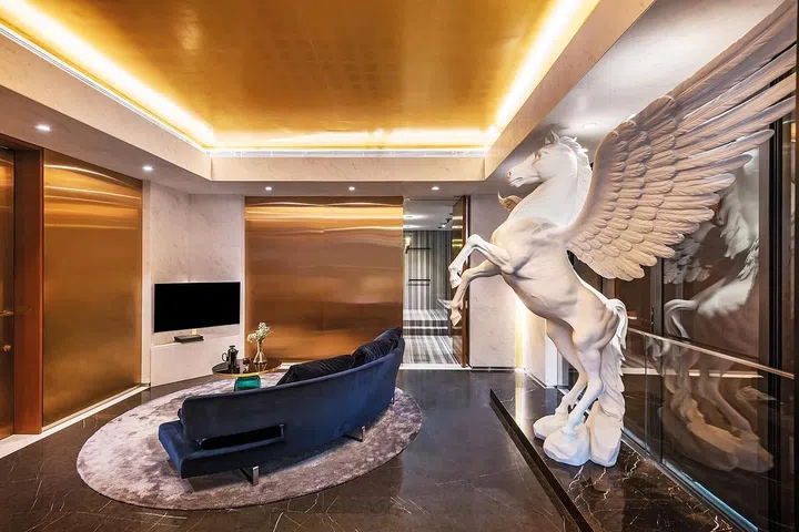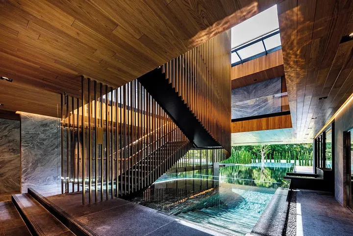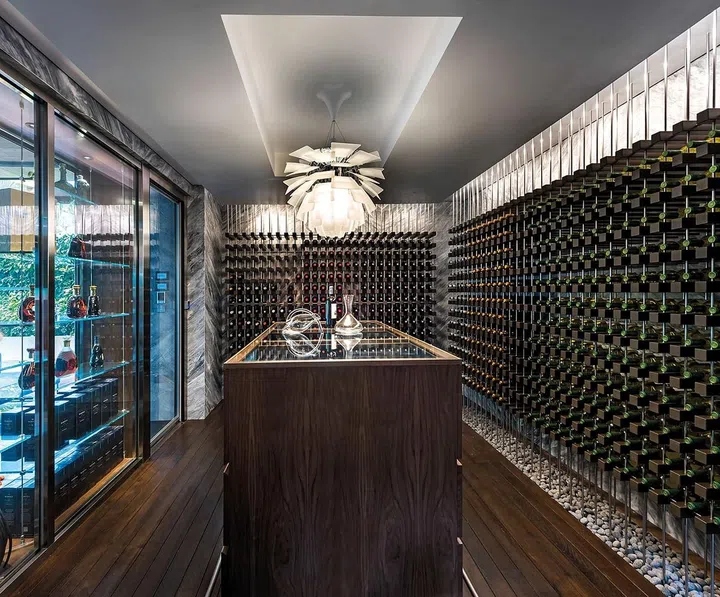 新屋秉持长幼有序,各居其室的原则,一共分为四层,依地势层层递进,一楼作为会客起居室与餐厅。二楼儿女各有独立活动空间,每间内部大约1100平方英尺,内设主卧和起居室,根据个人需求而做不同的设计;三楼阁楼则是大家长林佑龙的卧室与书房;地下室包括游泳池、健身房、壁球馆、电影院、卡拉OK房、游戏室及酒窖,生活机能完整丰富。林佑龙个性爽朗健谈,疫情前常在家里宴客,面对绿意盎然庭院的酒窖也特别连接宽敞的酒吧区,让他与亲友可以在名师灯具Louis Poulsen PH 松果灯照耀下一边把酒言欢,一边欣赏庭院的百年老树。