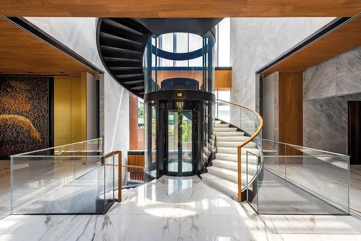 当初为了留地,建筑设计师把屋身缩小限制在一定范围内,为了引进自然光和通风设计,分别以高达10.5米,从一楼延伸到阁楼的植物庭院和水景庭院,与周围自然环境融为一体。室内则以意大利大理石和原木作为主建材,先从意大利进口大理石板再对纹拼接。
