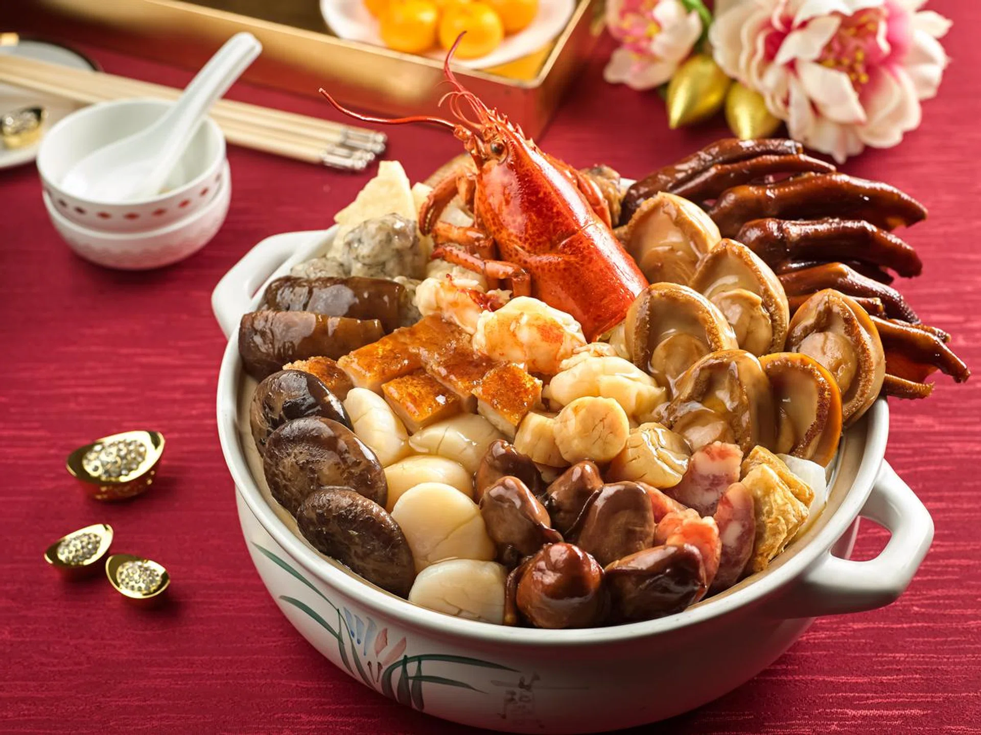 今年推出的盆菜也以龙虾为主角,“龙虾球鲍鱼盆菜”共使用了19种珍贵的食材,包括龙虾肉、鲍鱼、带子、瑶柱、鲮鱼球、花菇、鹅掌、海参、蚝豉等等。