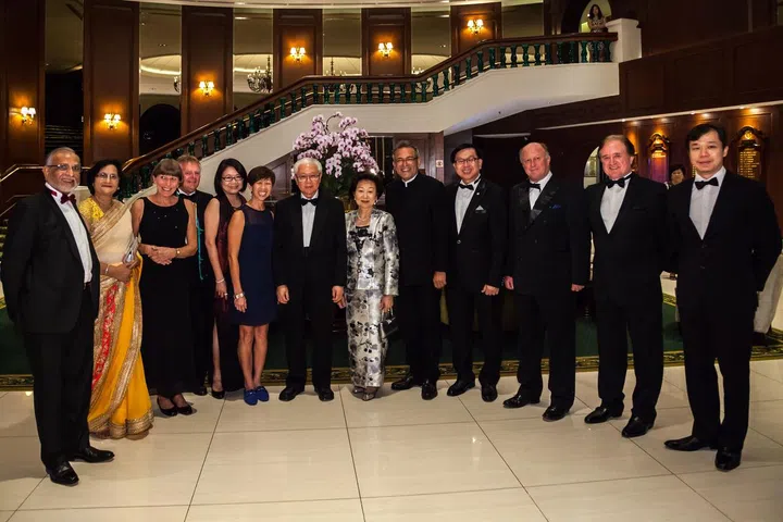 左至右: Zoeb Sadiq, Fatema Zoeb Sadiq, Else Stokkmo, Rolv Stokkmo, Lana Lim, Susan Wiener, President Tony Tan, First Lady Mary Tan, Robert Wiener, Eugene Lim, David Palmer, Roger Hancock和Kelvin Kaw。