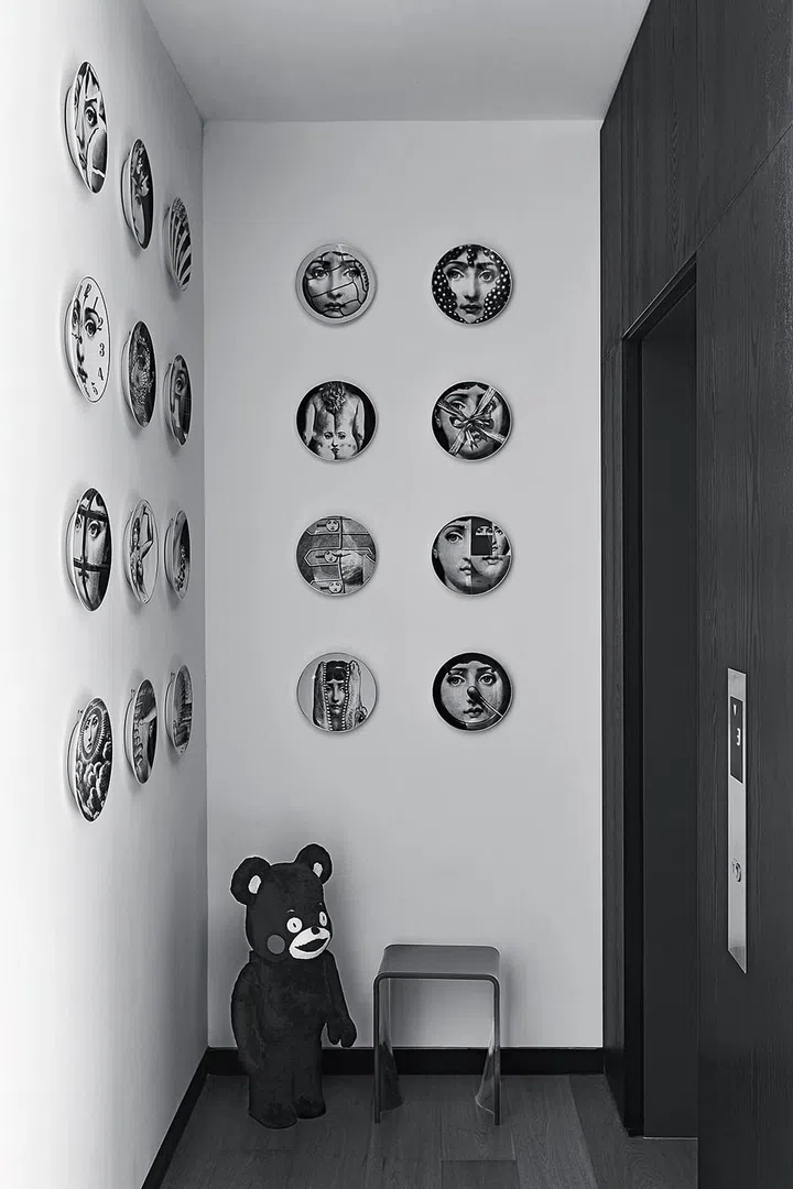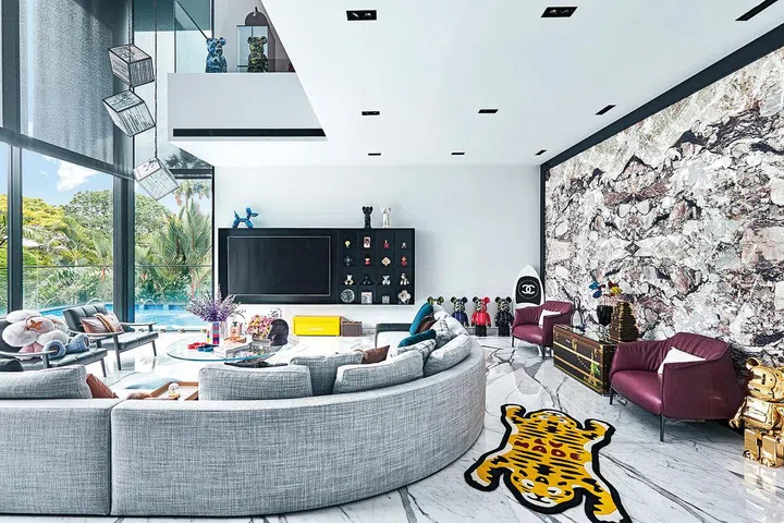 步入客厅首先映入眼帘的是两层楼高的黑色开放式壁橱,展示了多个限定款BE@RBRICK公仔;与展示墙面对面的电视墙下方则摆放了黄色的路易威登音箱搭配法国装置艺术家Francois Bel 模拟小宇宙爆炸的标志性作品。大理石墙面前则摆着路易威登大小硬箱,既是完美的摆设品,也能够当咖啡桌。