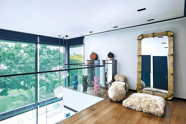 二楼有三间卧室,充分利用开放空间;走廊延续一楼的风格,也摆放了主人夫妻的艺术及精品珍藏,另一边则放置了一个巨型灯镜。对热爱时尚、喜欢研究穿搭的姚婧来说,这无疑是最佳的试装室。热爱时尚的她喜欢有型又舒适的裤装,平时喜欢从事水上活动,她有着修长的身段,能够轻松驾驭不同的风格。小岛上的日子,姚婧把生活过成诗。