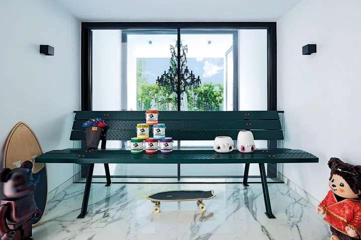 客厅是生活的轴心,主人家涉猎甚广,以时尚精品和艺术品混搭出摩登又充满趣味的生活空间,从高级精品到街头品牌Supreme的滑板,到英国当代艺术家George Morton-Clark的雕塑,错落有致的散布四周,处处精彩。