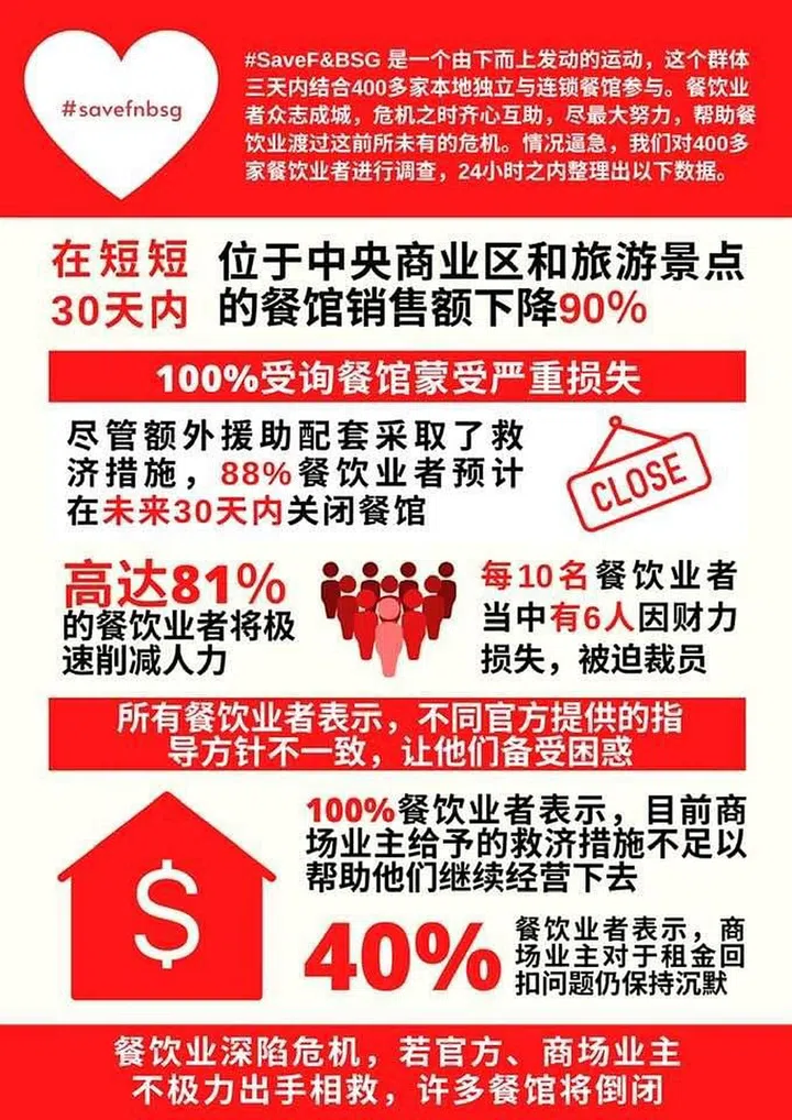 新冠病毒肆虐下,各行各业皆受影响,而其中受到较大冲击之一的,当属餐饮业。你或许已经注意到,近期社交媒体上开始出现 #savefnbsg的标签(hashtag)。这是由包括餐饮巨子卢立平(Unlisted Collection)以及Beppe de Vito(IlLido Group)在内,本地餐饮界人士发起的关怀行动,希望借由大众与社交媒体的力量,提高餐饮业者“市”气。团队连同其他餐饮集团包括Lo and Behold、Spa Esprit、同乐餐饮集团、乐天集团等,为同行提供或分享鼓励与咨询等支持。大众亦可以通过#savefnbsg的标签传达正能量,为本地餐饮业集气。