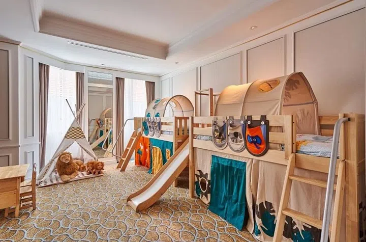 InterContinental Singapore动物主题亲子套房采用日本简约木色风格,房间面积达到52平方米,适合两名成人和两名孩子入住。房间内设计了定制双层儿童床,床上覆有半圆形的床罩,营造出半私密的空间感,与互动儿童区、迷你活动桌和儿童帐篷相连。孩子们早上醒来后可以顺着滑梯滑下床,这不仅让起床时光更有趣,还能减少一些起床时的不适感。此外,房间还提供室内娱乐设施、银河小夜灯、DVD电影娱乐与爆米花,以及成人和儿童的晚餐套餐和迎宾礼品。