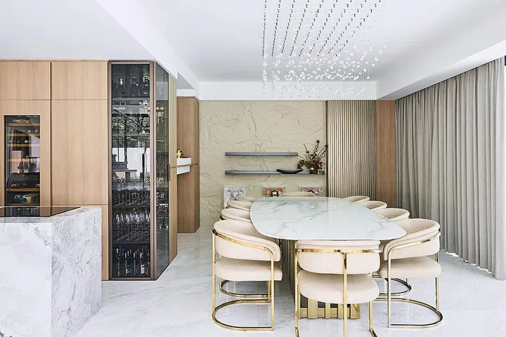 家,最重要住得舒适舒心。梁文珊主张采用明亮的白色为主调,配以白色灰纹大理石及大地色皮制沙发,营造摩登奢华感,“与其填满不同色彩,我更倾向简约设计。我很容易感到无聊,日后可能想改变。对我来说,目前房子就像一张空白的纸,日后即便要添加不同元素也更容易。”建筑时间费时三年,经历疫情和年岁成长,她说当初拿到钥匙时的某些想法和构思也不断改变,“我曾经很喜欢金与大理石这样的搭配,但现在我更倾向于更温暖更柔和的设计,因此逐步做了不少调整。”
