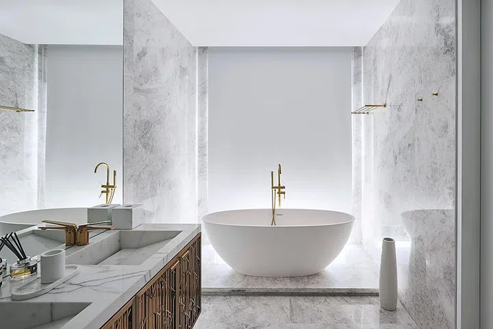 主卧浴室空间大,浴缸与大理石展现星级酒店般的奢华感。