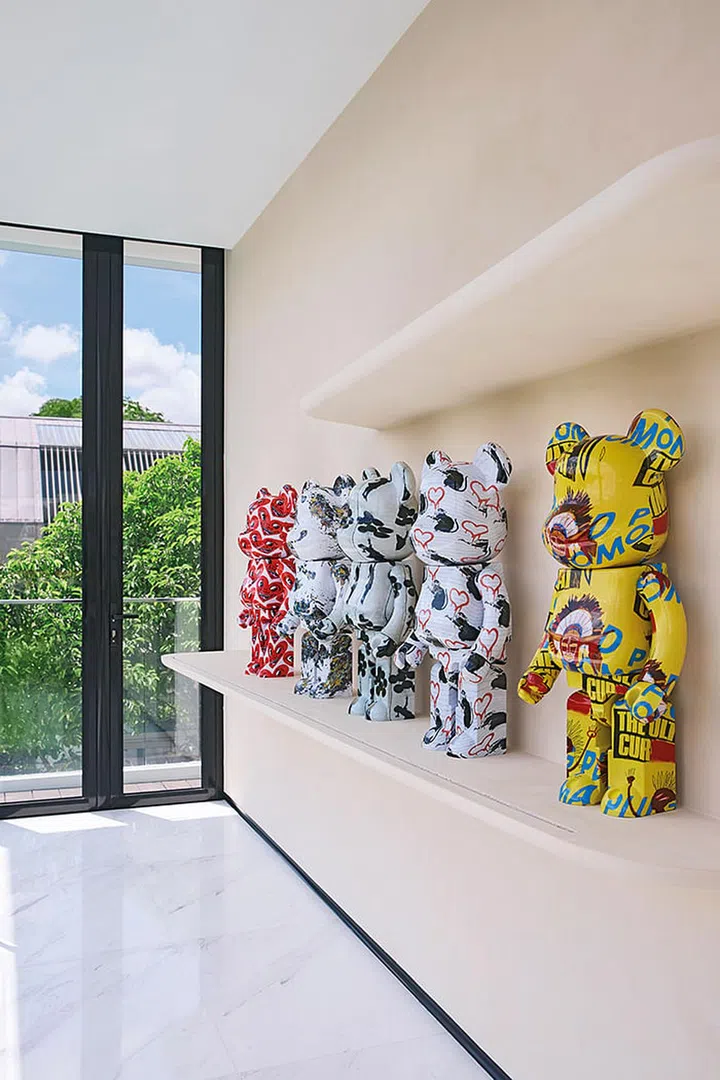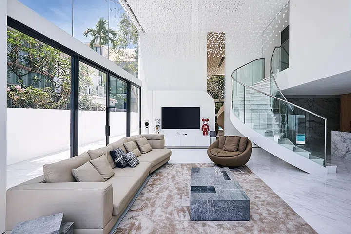 梁文珊与家人在2023年前夕迁入新居。三年前,她买下现址的旧房子拆掉重建,费时约三年,期间因冠病疫情,工程延宕;她解释,过程中也因为室内工程不达标,多个部分重新拆建。她笑称自己热爱太阳,非常享受自然光。“从小我就梦想拥有一栋玻璃屋,这梦想在常年酷热的新加坡是非常不实际的,要找到高品质的玻璃并不容易,我必须在支出和梦想之间取得平衡。” 透明的玻璃屋采光良好,想必冷气花费也不低,为此她特别在屋顶装置99个太阳能电板,除了节流也更环保。
