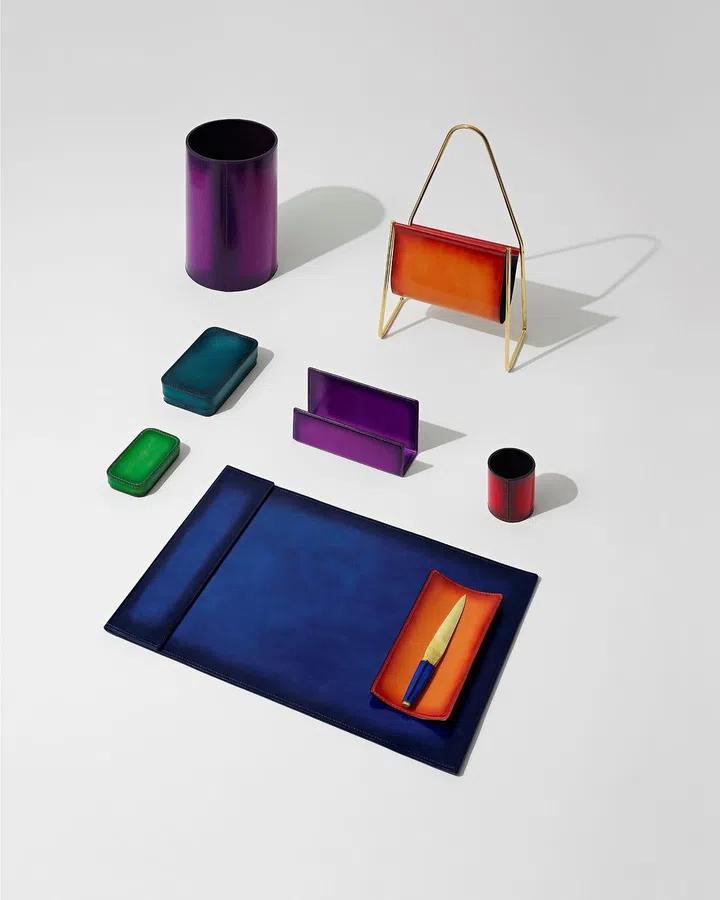 Berluti系列中的杂志架与开信刀源自1950年,整体采用生黄铜材质,表层覆以Berluti 标志性的Venezia 皮革;另一组圆弧边角的矩形收纳盒,亦是由Venezia皮革手工缝制而成,是Carl Aubock二世于1951年制作完成的。他的儿子Carl Aubock三世于上世纪 60 年代创作出办公桌垫、笔筒、笔架、文具收纳盒和废纸篓,同样全由经典皮革手工缝制而成。Afra和Tobia Scarpa于1972年创作的长形盒与方形盒,有着完美的黄金分割比例,标准纯银材质的盒体经切割后折叠,采用铜材与锅钉饰面,内里则由Venezia皮革打造。
