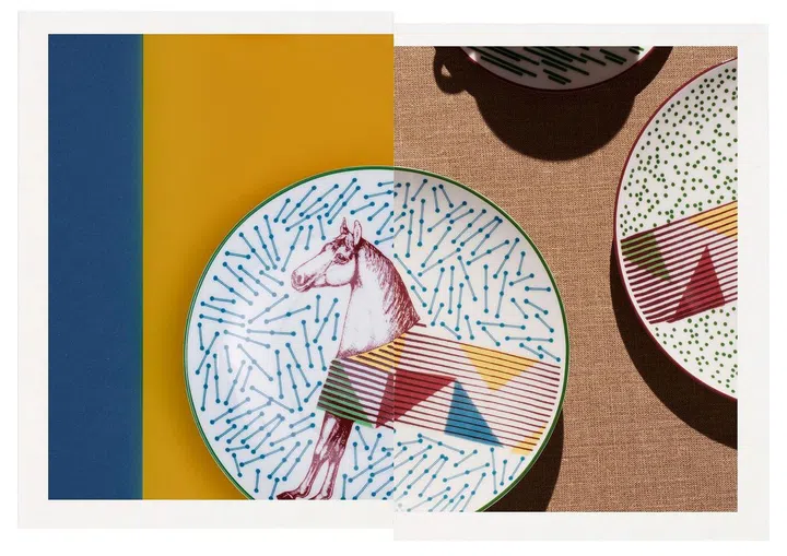 在Hermes全新餐瓷系列中,设计概念来自于设计师Gianpaolo Pagni在Emile Hermes博物馆馆藏中发现的一匹马的雕刻,他以骑师的丝巾骑士服为灵感,为马匹装饰缤纷的图纹饰带,成为此餐瓷系列的主要元素,俏皮的设计让茶杯与杯碟洋溢着活泼气息。