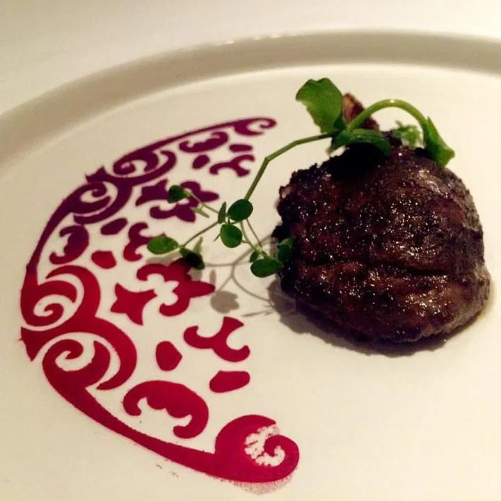 这道Rangoli羊排,名字的哟来是印度彩砂地画艺术,主厨以甜菜根和甜薯酱汁在餐盘上绘制传统图纹。