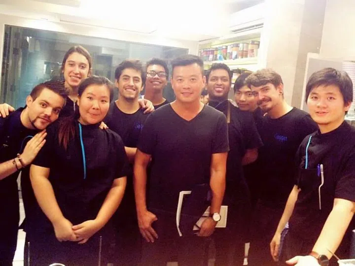 作者胡锦伟与Gaggan年轻的厨师团合照。主厨不在,这支生力军肩负为食客打造精致餐点的重任。
