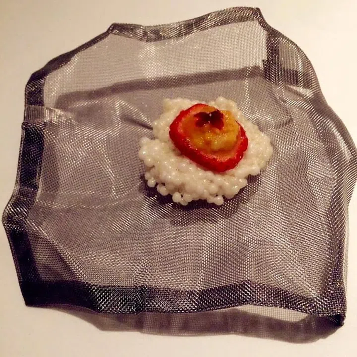 第一道前菜Drewdrop,覆盖冰块的叶片上躺着是露珠般晶莹的芦荟果冻,一口吃下甘香无比,叶子则提供辛辣口感。