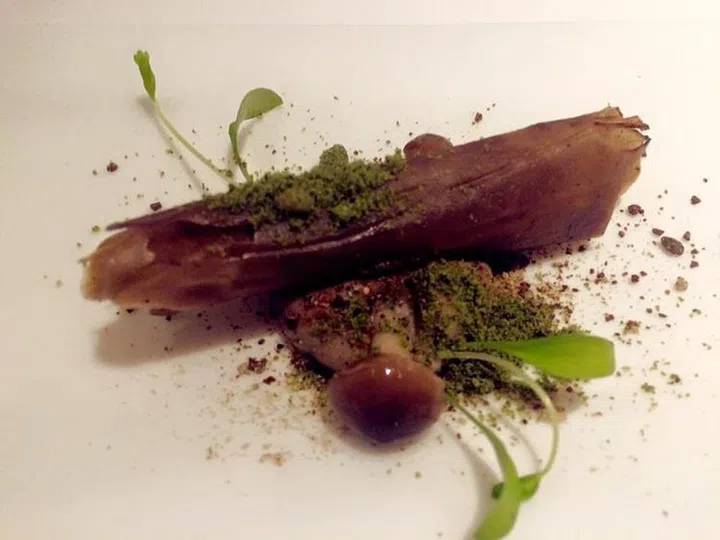 Magic Mushroom,由风干菌类和松露制成的树干,周边洒着野生小蘑菇;香脆“树干”里裹着松露慕斯和青辣椒馅料。
