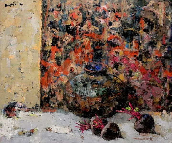 《紫萝卜与瓶》背景底色多彩斑驳,层次丰富。