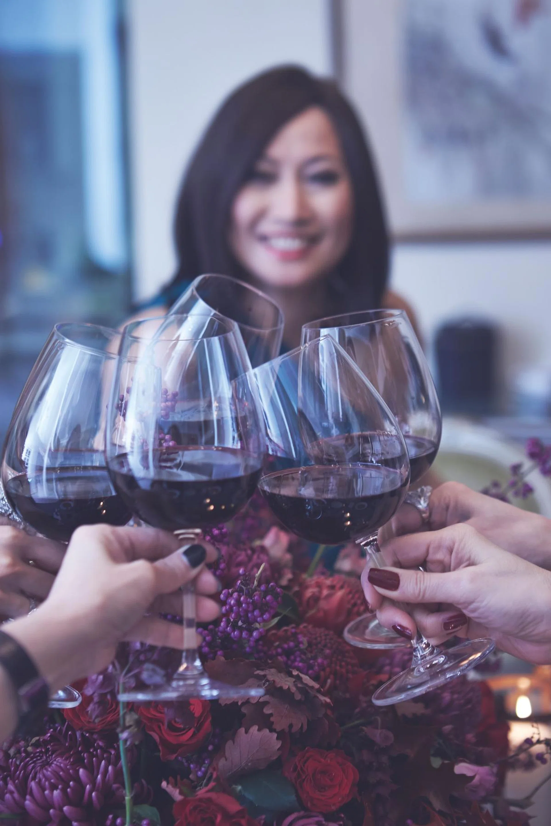 花艺设计的灵感源自荷兰静物油画,酒红色、深红深紫以及秋季花卉色调巧妙交织,配上深银色系的花瓶, 共同营造神秘高雅的感觉,与Tan Khar Nai家里典雅的巴洛克风情相得益彰。浓郁的色彩在米黄色家居色调的陪衬下,营造更强烈的视觉效果。这种花艺效果营造柔美妩媚的女性气息,同时也带出欢愉的节日氛围与晚宴的隆重感。