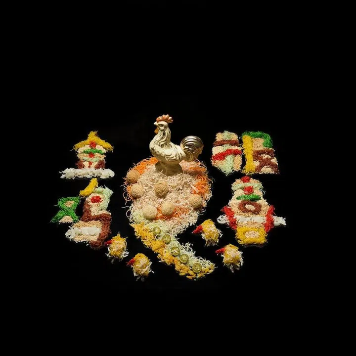 梁志贤用23种材料勾出具美感的“鸡”轮廓,“二三”在粤语又寓意“鱼生、余生”,巧妙呈现多层吉祥意义。