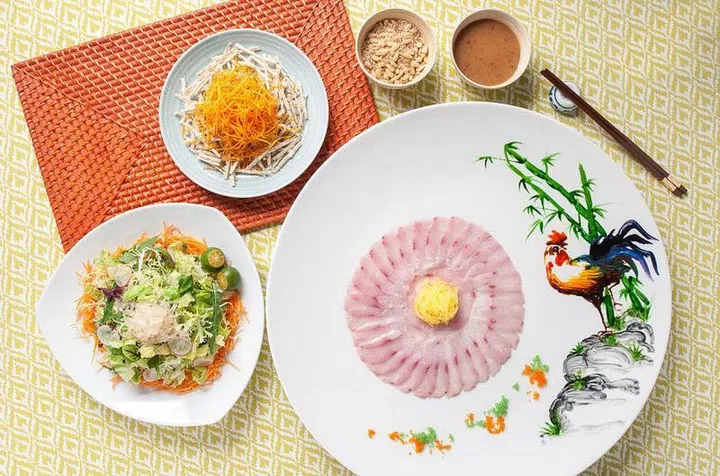 富丽敦酒店(The Fullerton Hotel)中餐馆玉楼(Jade Restaurant)的执行总厨梁志贤,今年制作特别版的金鸡招财鱼生,需要四天前预定。