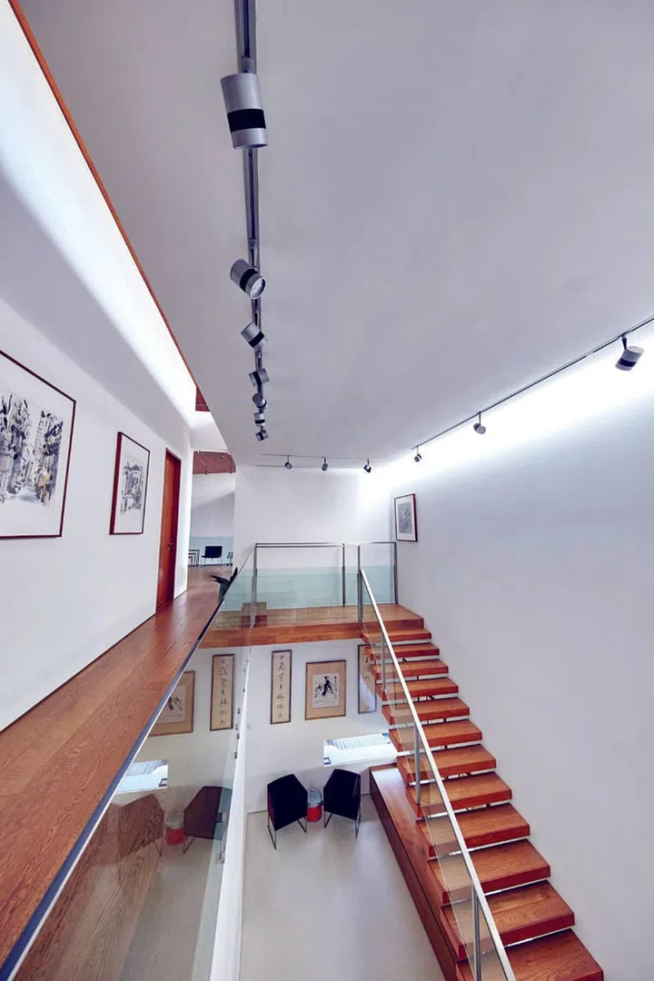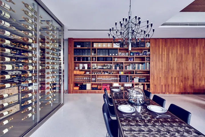 大厅一隅的透明酒柜兼具实用性和美感,喜欢品酒的Andrew特别请来本地著名酒柜设计公司