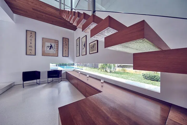 Andrew和Angela把渴望转换成家的样貌,把爱巢打造成离世度假风格,处处透露一丝惬意。这栋两层楼的长形建筑由本地著名Ong&Ong操刀,采开放式设计,把室外的蓝天绿地引进大厅,融为一体。