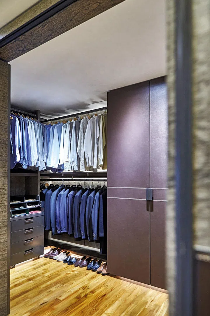 连接主人房浴室的步入式衣橱属于男主人,设计雅致、大方的深褐色B&B Italia衣橱是屋主特别向品牌所定制的,不但与居家的整体设计相辅相成,也体现出男屋主的细腻品味。而如果可以重新改变家中的任何一点的话,夫妻俩都不约而同地表示,会将连接主人房浴室与男主人的步入式衣橱的墙壁打通,换成落地玻璃,以更好地展示及欣赏这个设计优美的定制衣橱。