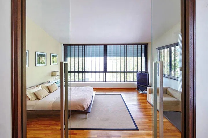 位于顶楼的主人房设计虽然低调简约,却是“卧虎藏龙”。原来屋主所选购的意大利品牌Former木质床架,是由单一木头所制作而成,价格不菲。由于夫妻俩的工作都相当忙碌,所以他们对主人房和浴室的设备特别讲究,希望极力营造出令人倍感舒适的氛围,好在忙碌了一天之后,好好放松身心,慰劳自己。