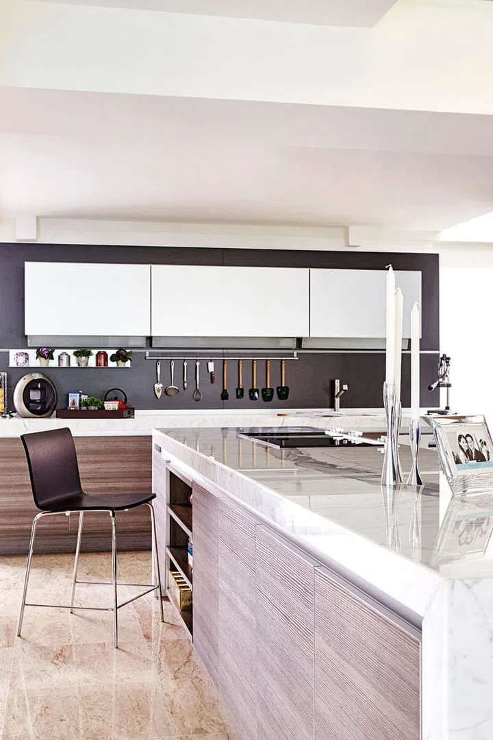 喜欢客厅殷紫色的B&B Italia沙发,顿时为客厅注入姿采。陈宝燕不忘透露夫妻俩都会弹钢琴,闲暇时偶尔也会在客厅尽情尽兴地演奏一番。开放式的厨房选用了德国品牌Poggenpohl的橱柜系列,搭配同样来自德国的Gaggenau厨房设备,尽显简洁的现代美感。