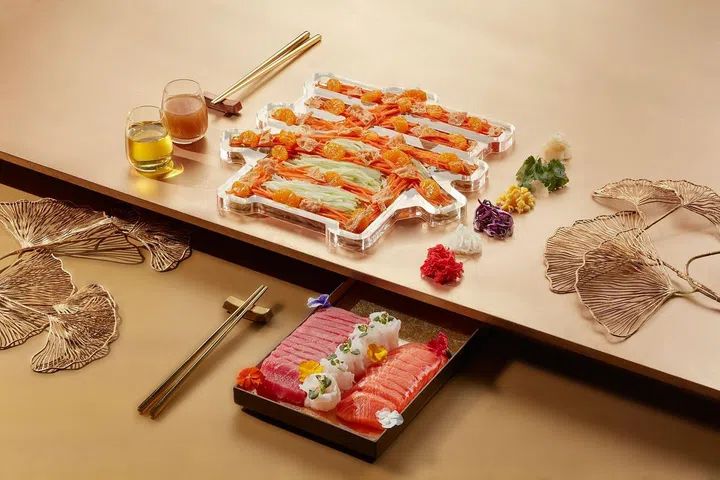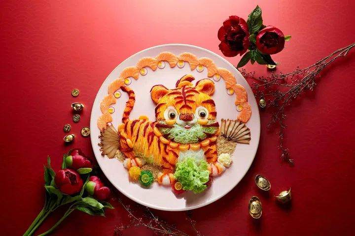 新加坡富丽敦酒店(The Fullerton Hotel Singapore)属下中餐馆玉楼(Jade Restaurant)执行总厨梁志贤结合美食与艺术,为顾客带来全面的感官体验。每年的鱼生都像是他的“画板”,任由他尽情发挥创意,今年也不例外。配合虎年,师傅特别将限量款“虎啸风生鱼生”(Premium Gold Rush Salmon Yu Sheng)设计成虎的形状,超Q模样惹人爱。这道奢华的鱼生最特别的是加入了酒店的招牌——香槟果冻,再淋上葱油和金桔酱汁,香郁诱人。1月17日推出,只供堂食。