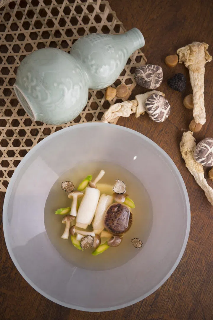 鸡尾酒配夕阳,是餐前最好的选择。炖竹笙采用最新鲜的食材,鲜嫩的鸡肉与花蘑菇碎片,再添加黑松露。而意大利灰皮诺则为当晚的晚餐开胃。