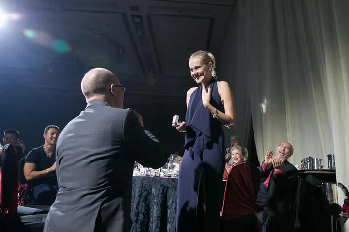 当晚的一大惊喜是其中一个宾客 Paul Searles特别与Wild Rice “串通”好,要向未婚妻Natalia Babich求婚的一幕。来自澳洲的Paul 是野米剧团之前制作“Hotel”舞台剧的音乐总监。当晚,主持人要全场来玩 “Kiss Cam” (只要镜头指向哪对情侣,情侣就要在镜头前接吻)。镜头来到了Paul 时,他却出乎预料地不单单只是亲下女伴,还下跪向未婚妻求婚,场面温馨。