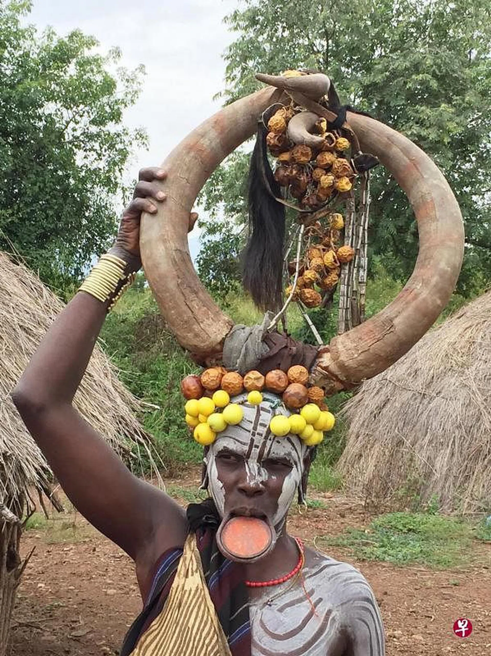 大大小小的唇盘,多以泥土烧制而成,髹上红、黑、白、褐各种色泽,上面还画着各种不同的图案和花纹,花里胡哨的,十分妖娆。经济能力较好的女子,会同时拥有许多可供替换以展示美丽的唇盘,我就曾在一所茅屋里看到高高地叠着的十多个唇盘。另外,也有些人喜欢使用较轻巧的木质唇盘。平时,她们不惮其烦又得意洋洋地把唇盘挂在唇上,招摇过市,只有在吃饭和喝水时才取下。取下唇盘后,呈长条状椭圆形的下唇,便像一条弯弯的香肠,松垮垮地垂挂在下巴前,看起来十分诡异。