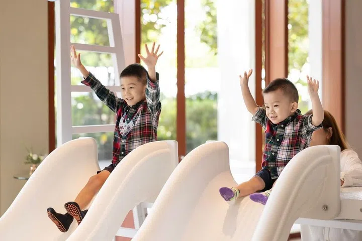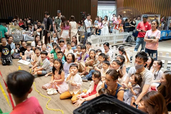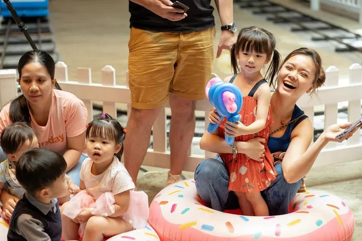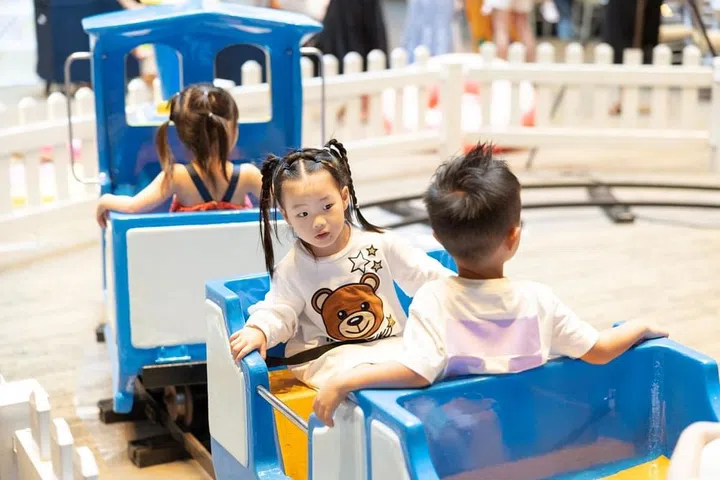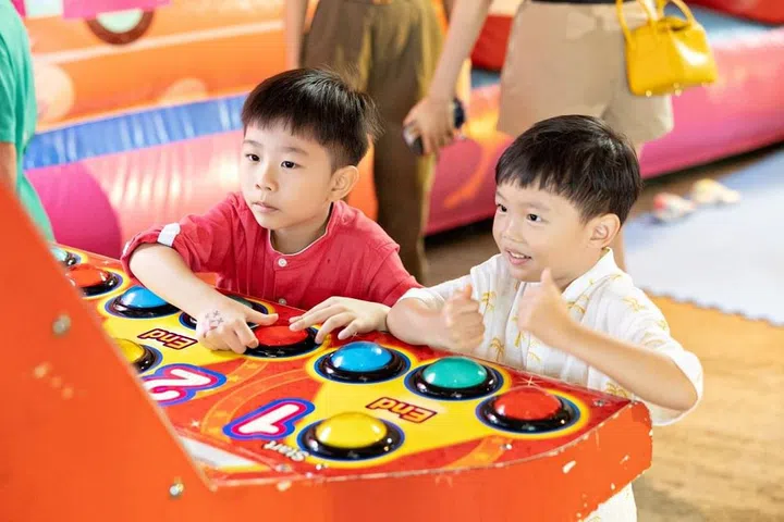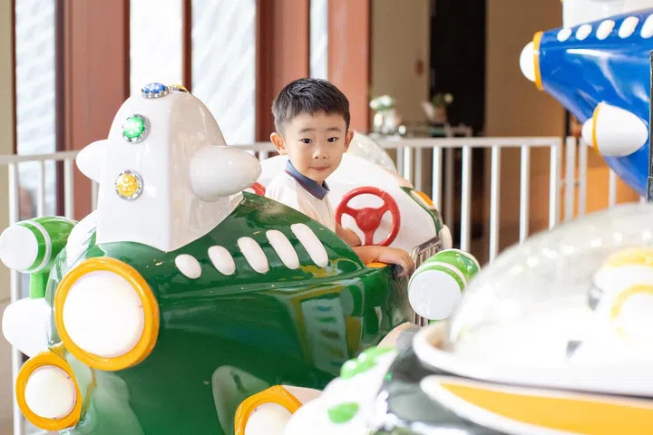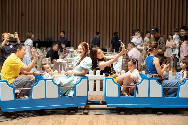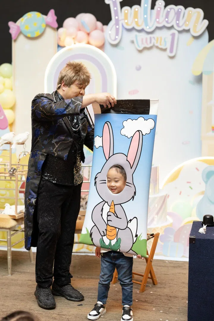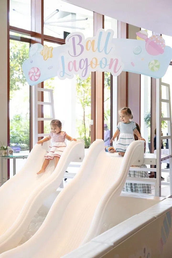 派对现场的入口处,装置了绚丽的糖果装饰拱门,让人仿佛踏入了童话世界。除了精美的生日蛋糕和布景墙,Wan Ting还精心策划了一系列丰富有趣的装置与活动,包括小火车、旋转小飞机、魔术表演、儿童充气滑梯、街机游戏和塑料球游乐空间等,让小朋友们可以尽情奔跑、追逐和欢笑,释放出无穷的活力。派对上不仅有孩子们的欢笑声,也让家长们积极参与其中,像是特设的电动车区域和迷你火车等,让大人和孩子们一起享受亲子时光。