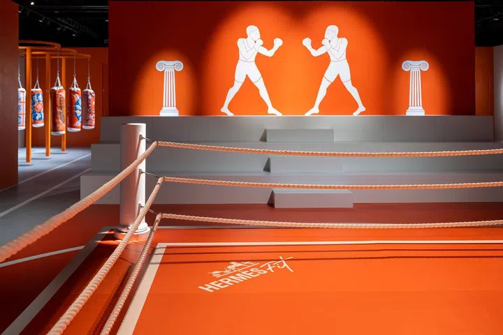 HermèsFit是一个充满趣味的互动世界,活动空间以品牌标志性的橙色为主色调,墙壁上装饰着精美的图像,有趣的空间内还设有预定健身课程的房间、一面配有定制爱马仕杠铃和壶铃的举重墙、以丝绸为灵感的健美操课程、兼作照相亭的拳击台、果汁吧等。